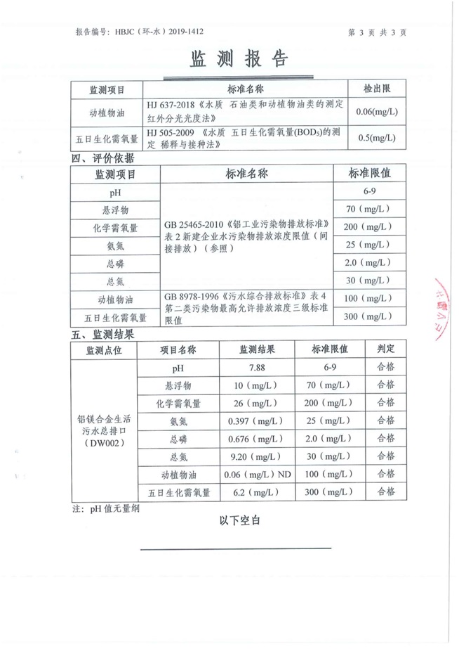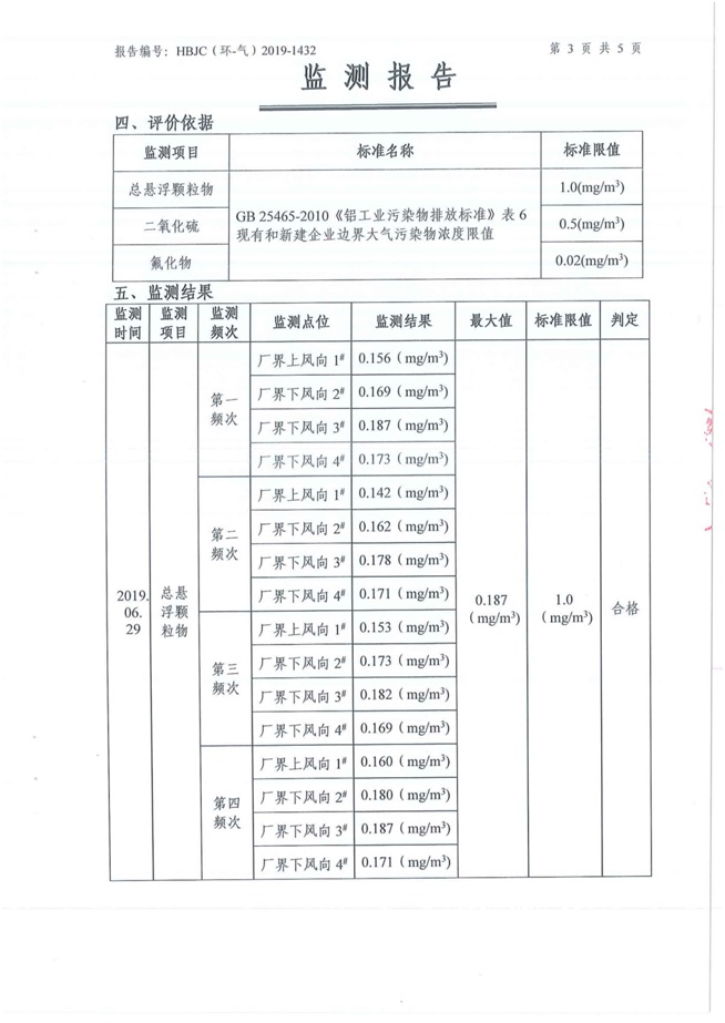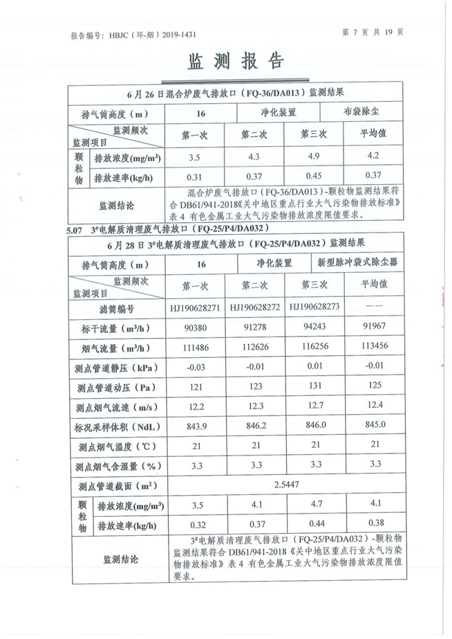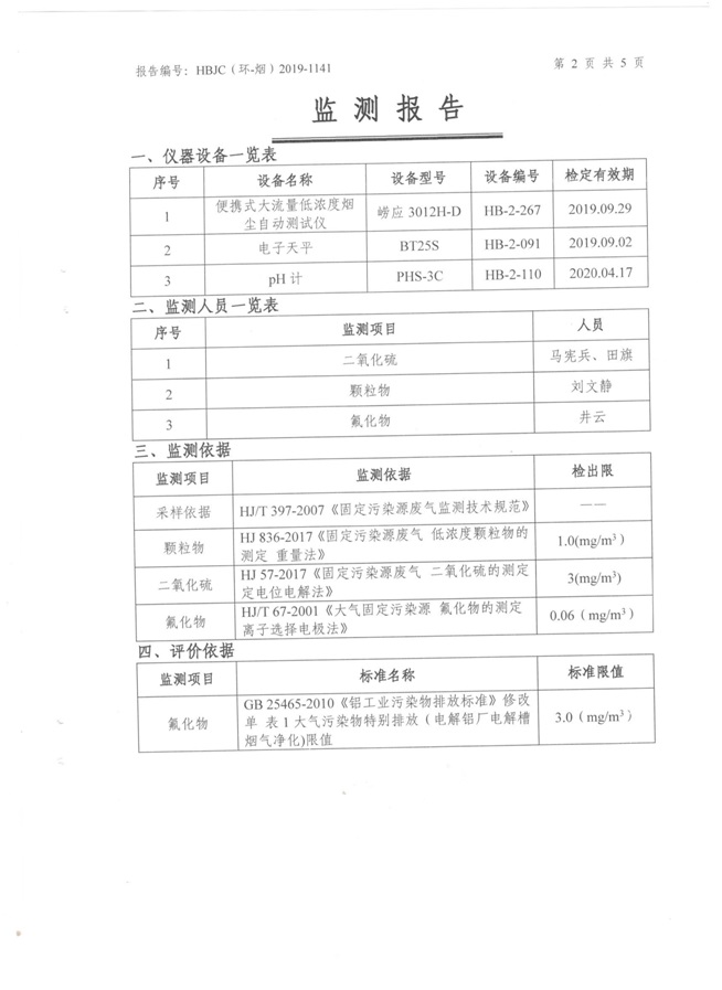 一、基礎(chǔ)信息: 陜西美鑫產(chǎn)業(yè)投資有限公司 統(tǒng)一社會信用代碼:91610200567136996Y 法定代表人:高曉兵 生產(chǎn)地址:陜西省銅川市董家河工業(yè)園區(qū) 聯(lián)系方式:09196982605 生產(chǎn)經(jīng)營和管理服務(wù)的主要內(nèi)容、產(chǎn)品及規(guī)模: 美鑫公司在陜西有色、陜西煤化兩大集團的正確領(lǐng)導(dǎo)下,在銅川市委、市政府的關(guān)心支持下,充分利用銅川資源型城市轉(zhuǎn)型政策,依托園區(qū)區(qū)位優(yōu)勢,擬投資150億元,建設(shè)年產(chǎn)30萬噸預(yù)焙陽極、120萬噸煤礦、30萬噸鋁鎂合金及配套動力站、20萬噸鋁深加工、年吞吐量500—800萬噸物流園等循環(huán)經(jīng)濟項目。該集群項目已被列入《陜西省國民經(jīng)濟和社會發(fā)展第十二個五年規(guī)劃綱要》,為陜西省“58123”項目之一。美鑫公司以循環(huán)經(jīng)濟為路徑,堅持經(jīng)濟增長與環(huán)境保護協(xié)調(diào)發(fā)展,聚合資源與資本,走綠色發(fā)展、清潔發(fā)展、低碳發(fā)展的循環(huán)經(jīng)濟轉(zhuǎn)型升級之路。 陜西美鑫鋁鎂合金分公司采用的500kA預(yù)焙陽極電解槽,自動化程度高,電解槽打殼、加料全過程均由微機自動控制,從而使槽罩開啟次數(shù)顯著降低,電解槽集氣效率能夠達到99%,大大地減少了煙氣無組織排放。項目配置了2套電解煙氣凈化系統(tǒng),經(jīng)捕集的煙氣通過排煙支管進入排煙總管,采用電解鋁生產(chǎn)原料—氧化鋁吸附阻濾煙氣中的氟化氫氣體及含氟煙塵,吸附后的載負氧化鋁進入袋式除塵器,經(jīng)氣固分離后進入石灰石—石膏脫硫系統(tǒng)脫硫。 陜西美鑫產(chǎn)業(yè)投資有限公司鋁鎂合金分公司2019年2季度自行監(jiān)測如下: 二、監(jiān)測方案: 1 大氣污染源監(jiān)測