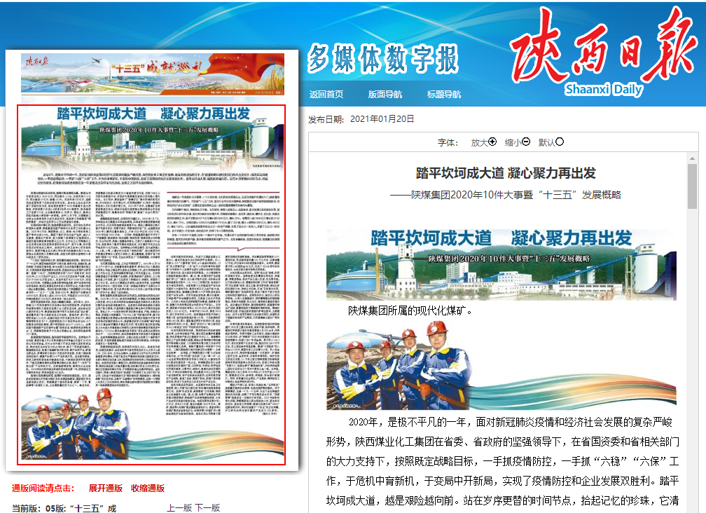踏平坎坷成大道 凝心聚力再出發 ——陜煤集團2020年10件大事暨“十三五”發展概略 2020年,是極不平凡的一年,面對新冠肺炎疫情和經濟社會發展的復雜嚴峻形勢,陜西煤業化工集團在省委、省政府的堅強領導下,在省國資委和省相關部門的大力支持下,按照既定戰略目標,一手抓疫情防控,一手抓“六穩”“六!惫ぷ,于危機中育新機,于變局中開新局,實現了疫情防控和企業發展雙勝利。踏平坎坷成大道,越是艱險越向前。站在歲序更替的時間節點,拾起記憶的珍珠,它清晰地映照出陜煤在這一年里曾走過怎樣不凡的歷程,又樹立了怎樣不屈的精神。 經營業績再創歷史新高,穩增長彰顯陜煤力量。集團全年實現營業收入3402億元,同比增長12.4%,實現利潤173億元,同比增盈16億元,增幅10.2%。完成投資233億元,超額完成省國資委下達的經營目標任務。在全省工業企業中發揮了頂梁柱的作用,被省國資委授予2020年穩增長突出貢獻獎,并連續第六次進入《財富》世界500強榜單,排名繼續上升至第273位,企業整體競爭力、創新力、管控力、影響力和抗風險能力得到進一步增強。去年11月下旬,中國煤炭工業協會全體領導班子成員親赴西安,現場授予陜煤集團“特別貢獻獎”,并將行業標桿中心交由陜煤股份承建。 抗疫保供沖鋒在前,急難險重鐵肩擔當。面對突如其來的新冠肺炎疫情,陜煤集團將復產保供作為各項工作的重中之重。2020年3月初,集團煤炭、化工、鋼鐵、電力等板塊復工復產率均達到100%。集團下屬礦井優化生產組織,減少人員聚集,提高生產效率,有力保障了疫情重災區能源供應。集團所屬的蒲城清潔能源化工公司、北元化工公司等煤化工企業迅速切轉至防疫物資原材料的生產,用于口罩、防護服所用無紡布的加工制作。在西安市公共衛生中心項目緊張建設中,集團所屬生態水泥公司快速行動捐贈水泥2754噸。國有企業鐵肩擔義的精神品格,在抗擊新冠肺炎疫情的斗爭中綻放出了新的光華。 “十四五”規劃新鮮出爐,高質量發展繪就藍圖。規劃中的下一個五年,集團將繼續堅持“以煤為基,能材并進,技融雙驅,蛻變轉型”的轉型發展戰略,爭當全國工業經濟高質量發展的排頭兵,為更好服務國家能源安全戰略、促進經濟社會發展作出新貢獻!展望“十四五”,陜煤集團要實現“16555”戰略目標,即到2025年,以10萬左右產業工人,6000億元左右資產總額,完成不少于5000億元營業收入,流通市值不低于5000億元,實現500億元利潤。創新型企業建設取得明顯成效,新產業培育實現實質性突破,建成區域國有資本投資公司標桿企業,為建設世界一流企業奠定基礎。規劃還首次研究提出了陜煤集團2035年遠景目標——“五個一”工程,即到2035年,集團資產總額超過10000億元,營業收入超過10000億元,市值超過10000億元,利潤總額超過1000億元,躋身世界一流企業行列。 脫貧攻堅成果豐碩,決勝小康履約踐諾。肩負陜北、關中、陜南20個村和安康市漢陰縣牽頭單位的幫扶職責,并承擔陜西省國資委助力脫貧攻堅第六合力團攻堅任務,在決勝全面小康的收官之年,集團繼續多措并舉打出脫貧攻堅“組合拳”,高質量完成了助力脫貧攻堅工作任務。截至目前,累計投入幫扶資金8.31億元,在榆林地區開發實施扶貧項目6個,推動精準幫扶項目317個,包聯幫扶的20個貧困村全部出列、9個貧困縣全部脫貧摘帽,累計幫扶脫貧3802戶12099人。在第四屆中國能源產業發展年會暨“脫貧攻堅·能源扶貧成果報告會”上,陜煤集團被授予十大突出貢獻企業、扶貧特色案例等12個獎項。 金融藍海弄潮逐浪,股權投資浮盈超兩百億。發揮資本平臺優勢,集團所屬上市公司陜西煤業近年來拿出不超過30億元的公司自有資金,對外合作開展了不涉及關聯交易的投資業務,擇優選定業內有實力的合作伙伴,建立了投資顧問模式。圍繞煤炭主業,構建了涵蓋新技術新方法、新產品新產業、新商業新生態、新需求新價值四個方面的投資地圖,明確了煤炭清潔利用技術、煤基產品等20個產業投資方向。在互聯網領域,按照上游網絡層信息傳輸基礎設施、中游感知層和網絡層硬件、下游應用需求端和運營商需求端的分類,確定了一系列“萬物互聯”產業投資方向。在新能源等領域,聚焦龍頭企業股權。2020年作為陜西煤業取得投資回報的第一年,陜西煤業已實現投資收益+投資浮盈超200億元。 智能化探索勇闖新路,智慧礦井建設領跑全國。近日,國家首批智能化示范建設煤礦名單由國家能源局、國家煤礦安全監察局聯合發布。陜煤集團下屬的檸條塔、黃陵一二號、曹家灘等7處煤礦入選,占全國數量的近十分之一。截至目前,陜煤集團已經累計建成36個智能采煤工作面,支持70%以上采面達到智能開采,并逐步實現繁重危險崗位由機器人替代作業。與之同步,集團編制了“智慧礦區”建設標準和規范方案,并與西科大、華為等合作,共同推進煤礦5G技術+智能化裝備和人才隊伍建設等工作。2020年下半年,全國煤礦快速掘進現場交流會、煤炭行業兩化深度融合推進現場會先后在陜煤集團召開,智慧務實的“陜煤方案”贏得了與會代表的廣泛認同。 陜贛聯姻再造典范,區域合作開疆拓土。2020年7月7日,陜西煤業化工集團與江西省能源局、江西省投資集團簽署戰略合作協議,約定共同組建煤炭銷售平臺,確保入贛煤炭價格不高于年度長協價、同期市場價、同期海進